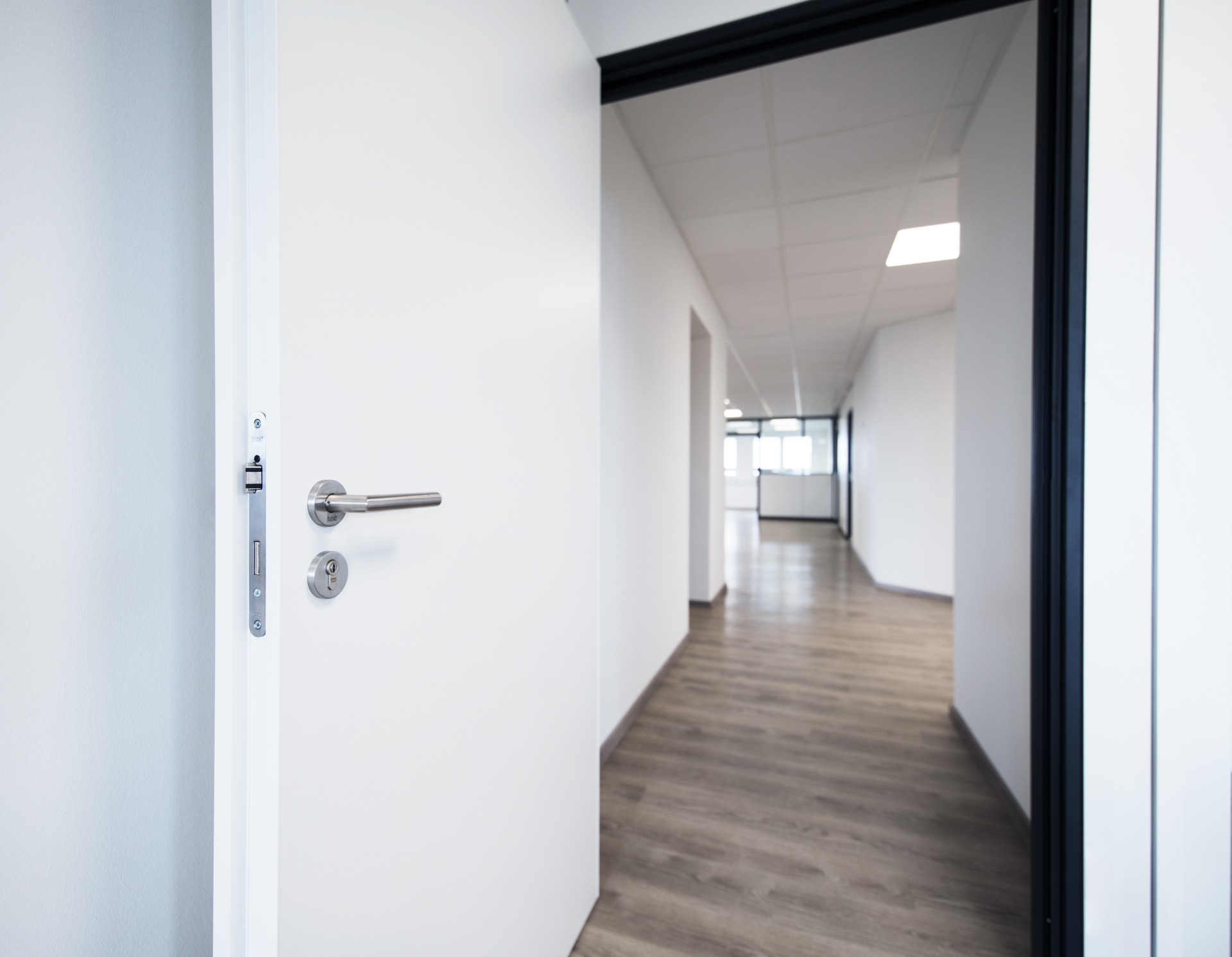 Die Wahl der Türen fiel auf moderne und funktionale Alurahmenelemente und Stahltüren der Firma novoferm. Zusätzlich installierte MHW Feststellanlagen in den Türen, die im Brandfall dafür sorgen, dass die Türen sicher schließen.