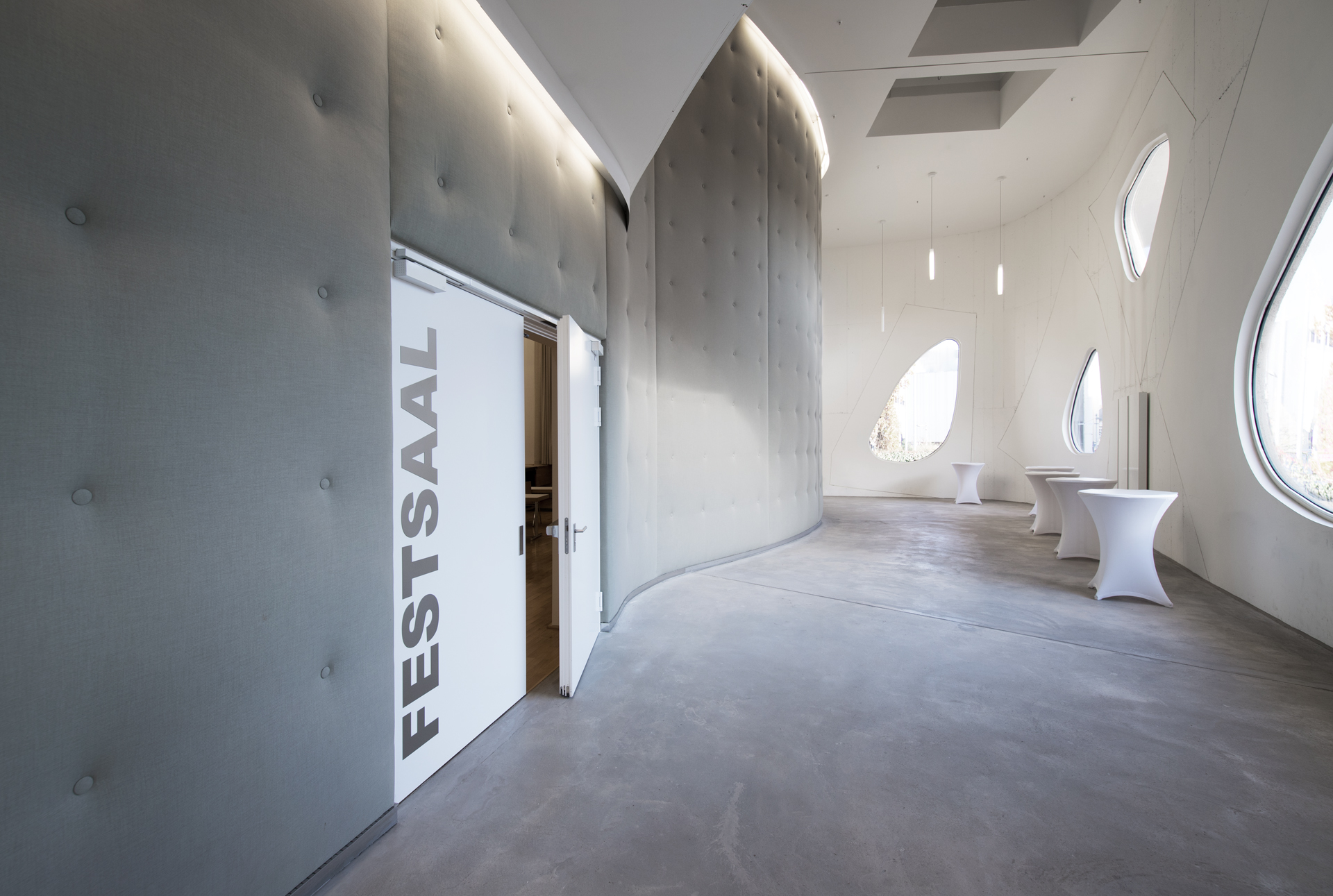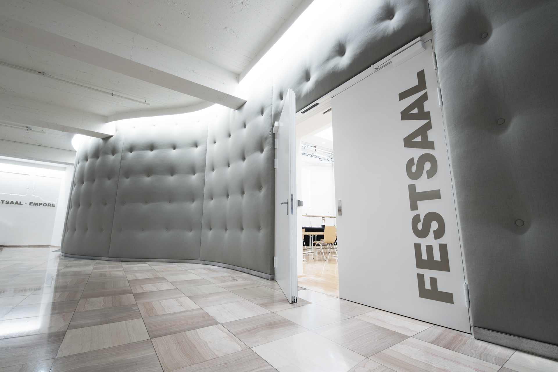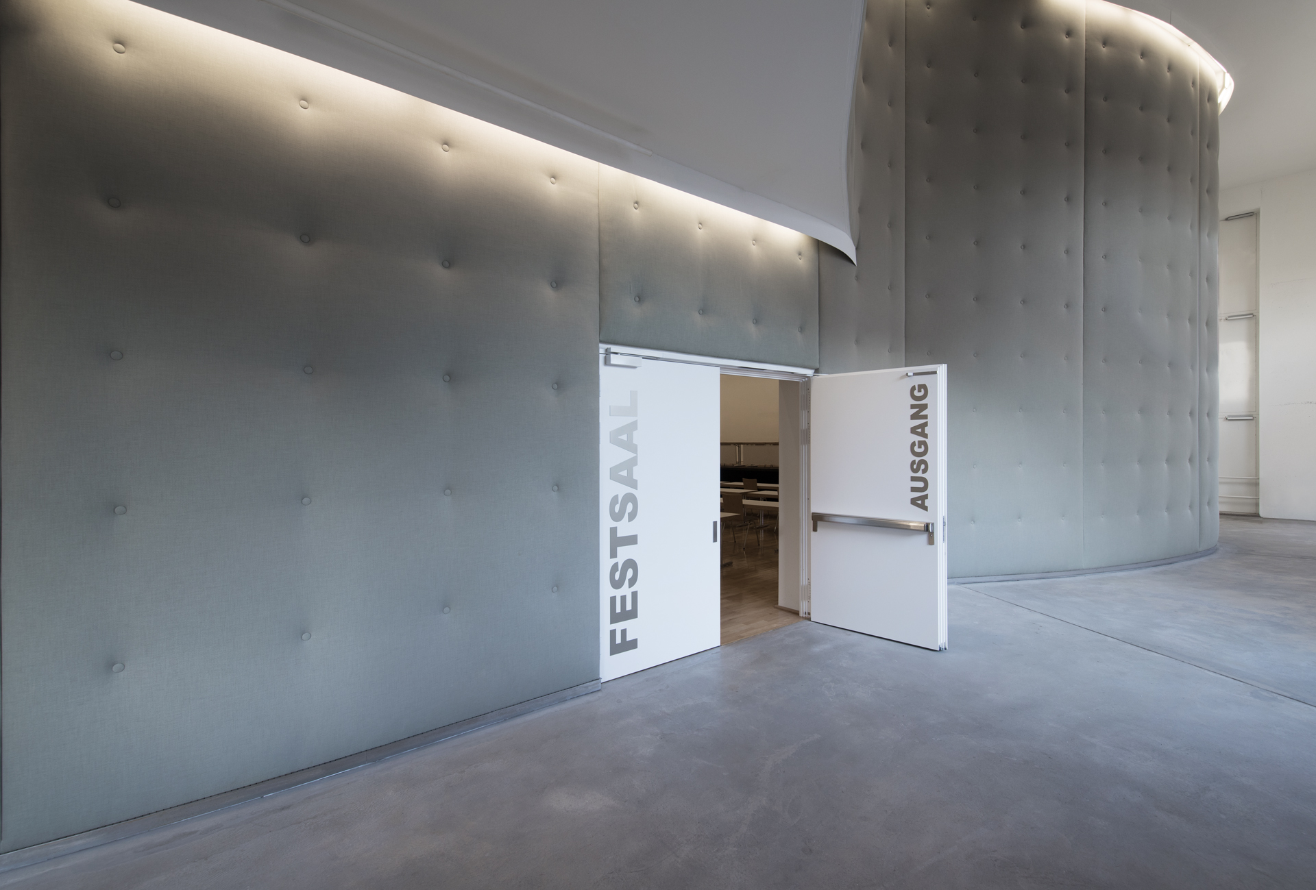 Die moderne Beschriftung auf der Festsaaltür erleichtert den Besucherinnen und Besuchern die Orientierung im Gebäude und fungiert zugleich als farbliches Stilelement passend zur grauen Wandfarbe. Glastüren in den Fluren unterstützen das besondere Lichtkonzept aus indirektem künstlichen sowie natürlichem Sonnenlicht.