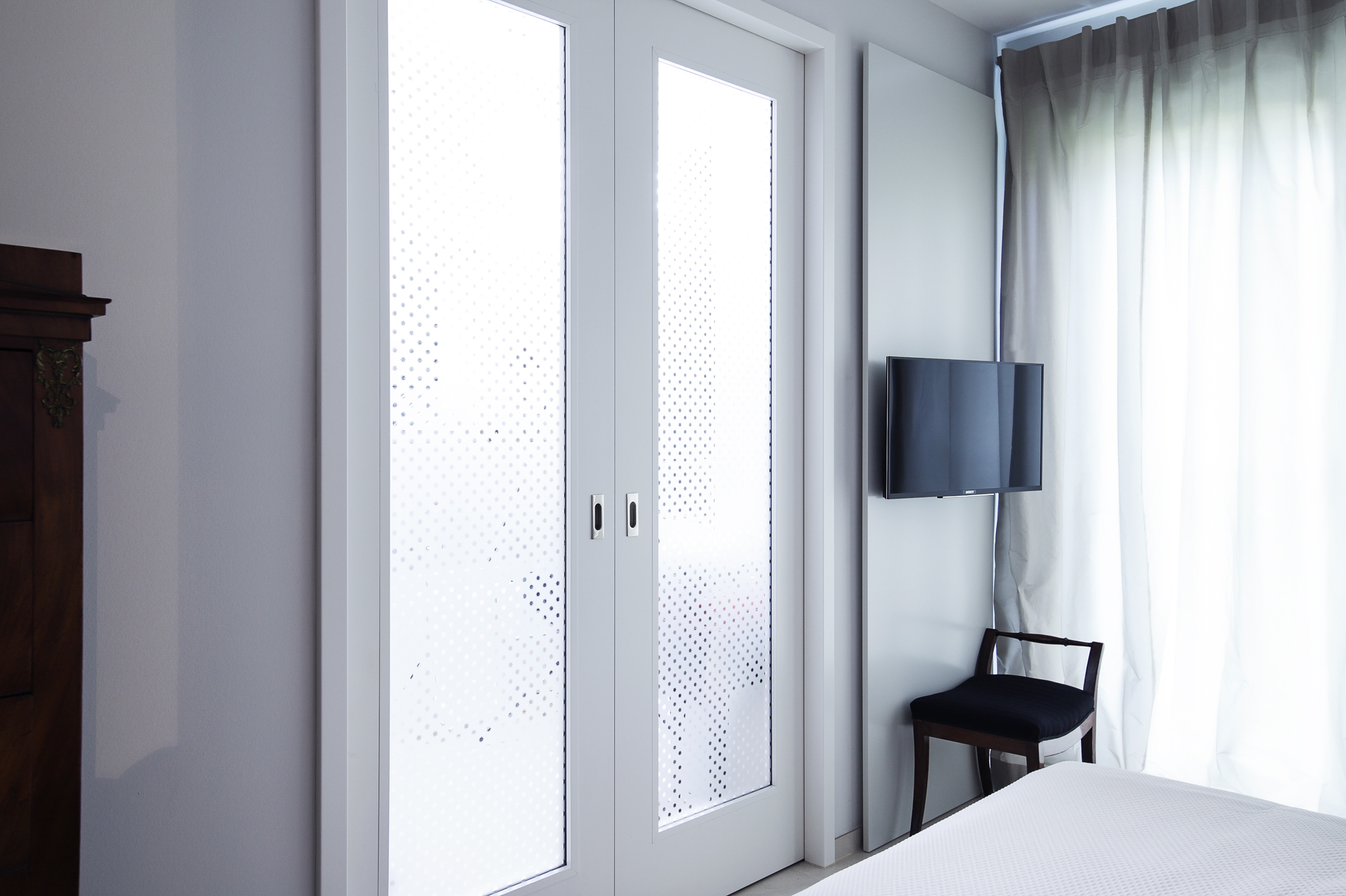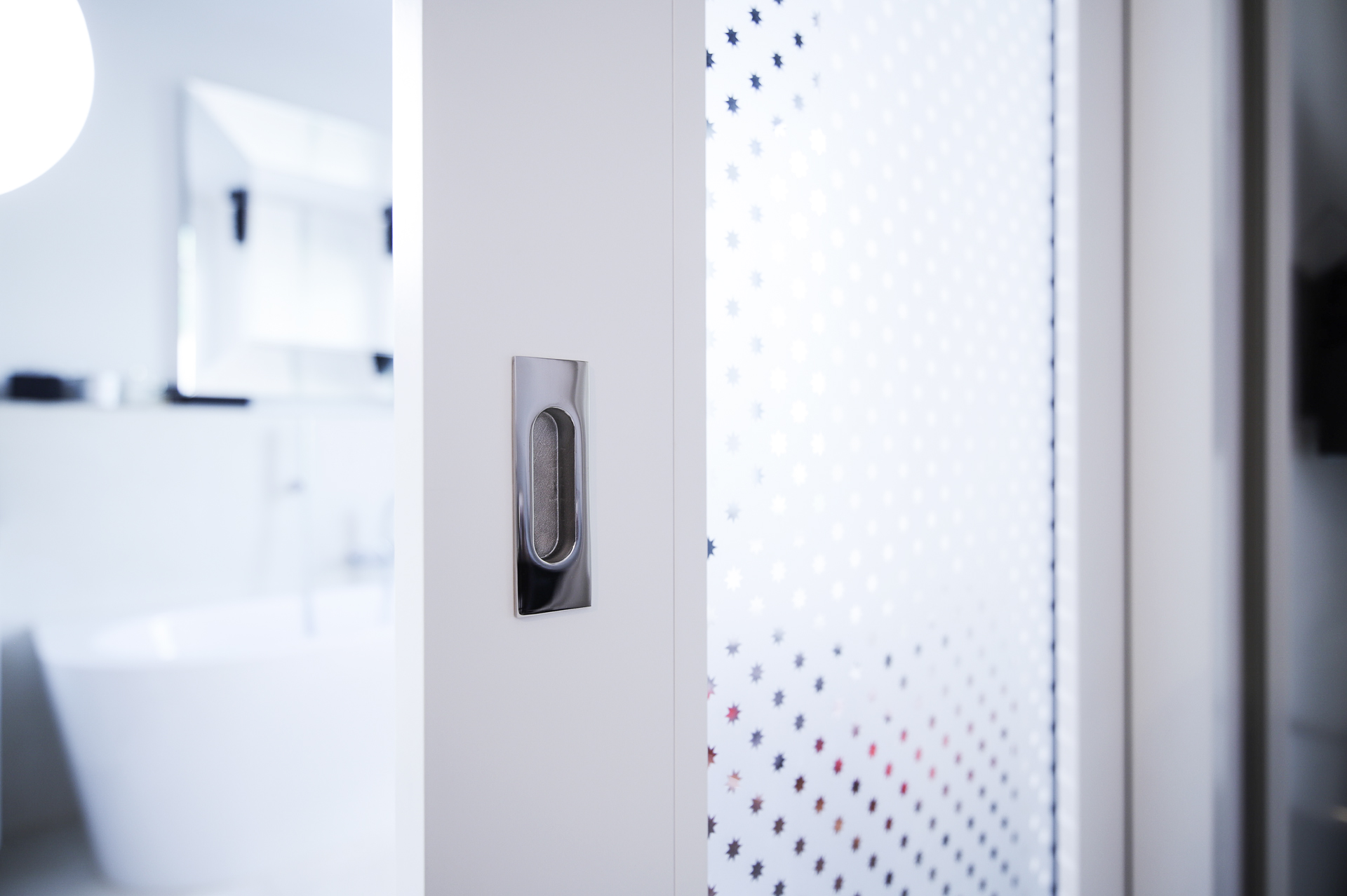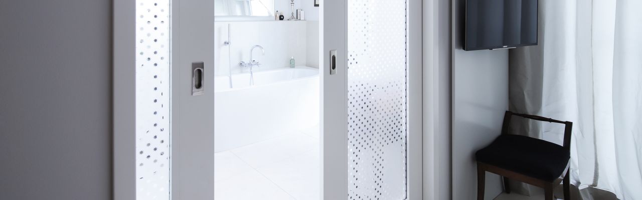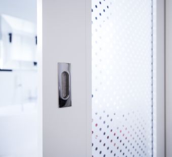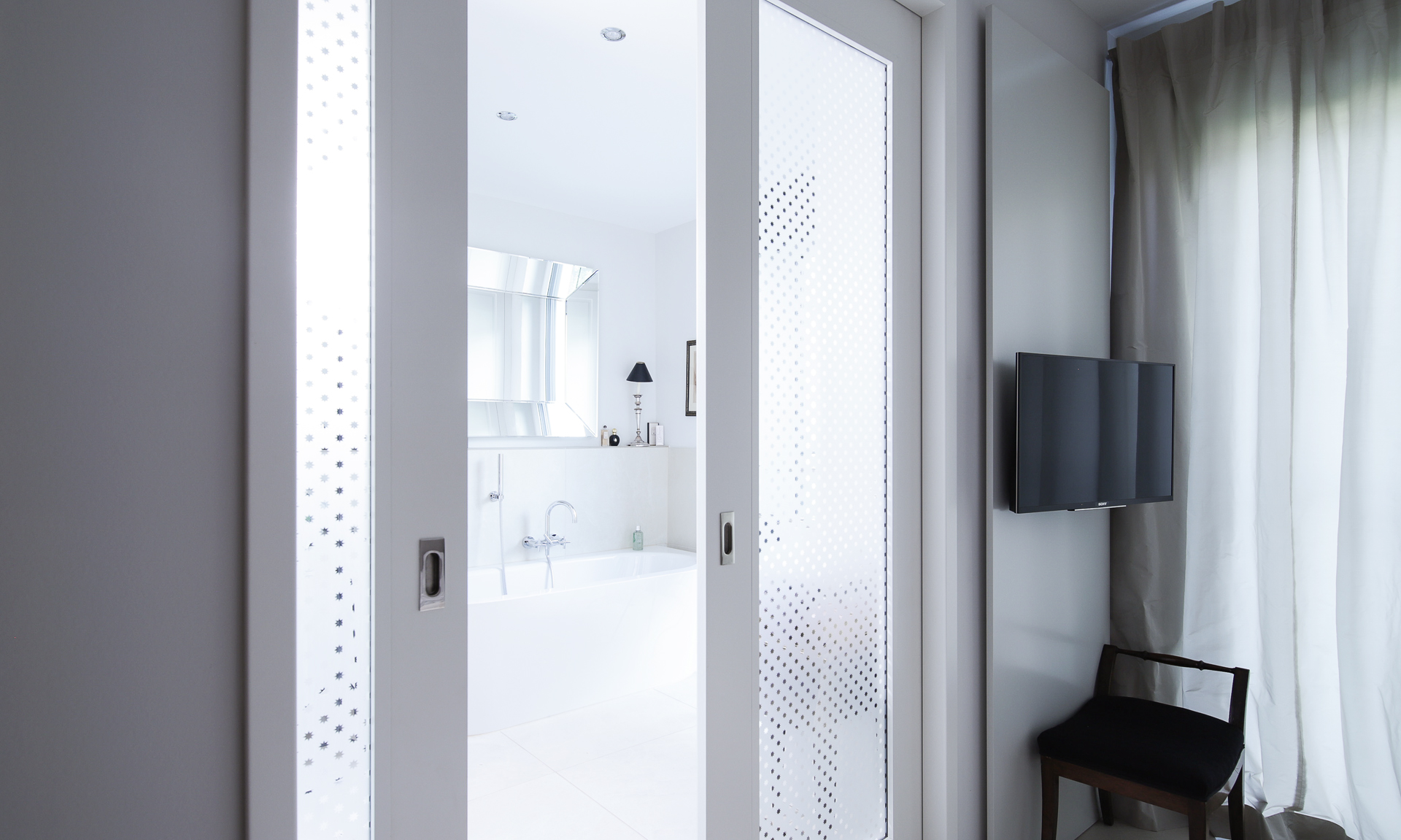 Eine lichtdurchlässige Schiebetür zwischen Schlaf- und Badezimmer sorgt für eine fließende Verbindung zwischen den Bereichen und trägt so zu einem offenen und lebendigen Raumgefühl bei. Die Schiebetür ist doppelt verglast mit einem besonderen Zusammenspiel aus satiniertem und durchsichtigem Glas. Zusätzlich überzeugt sie mit polierten Edelstahl-Beschlägen.